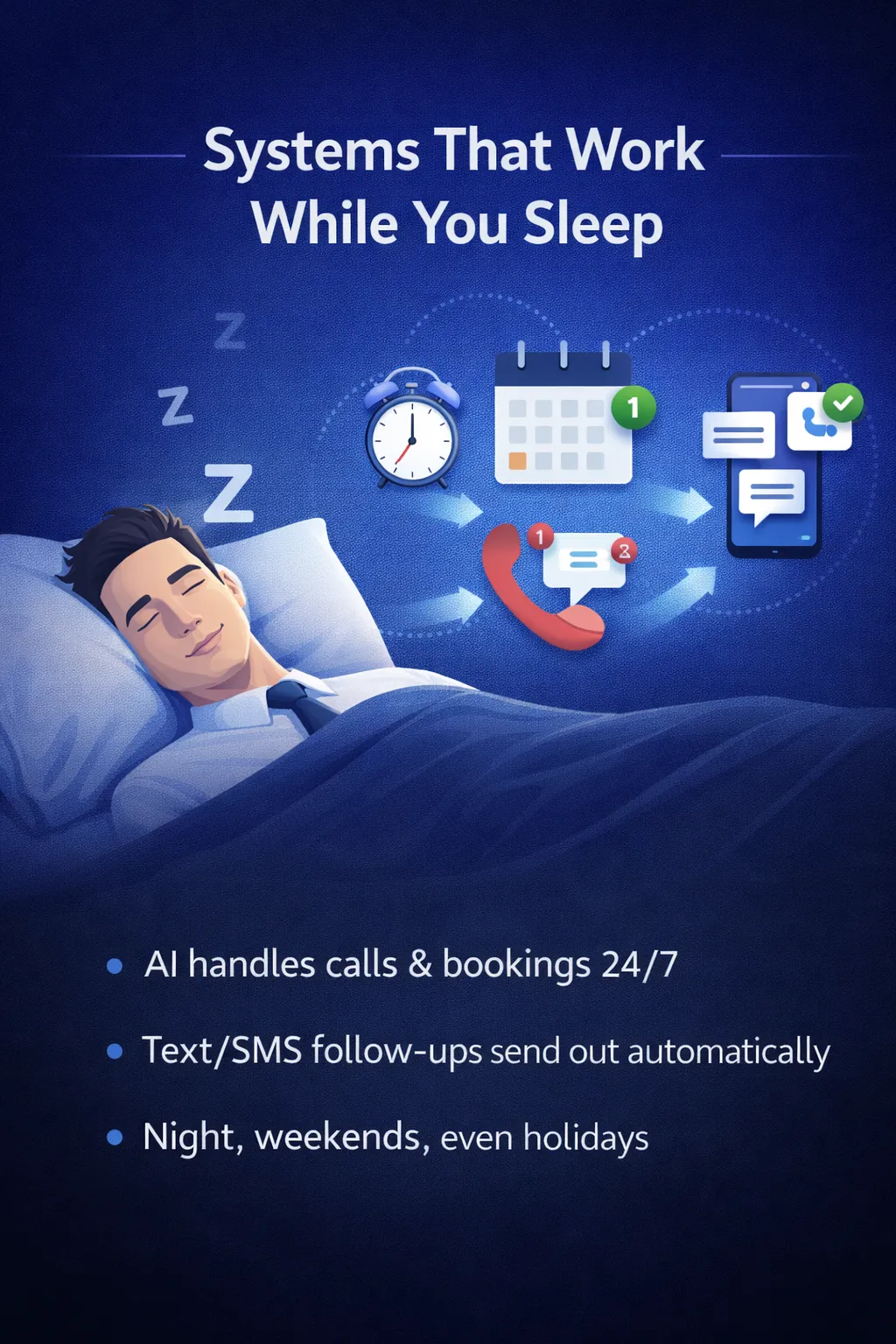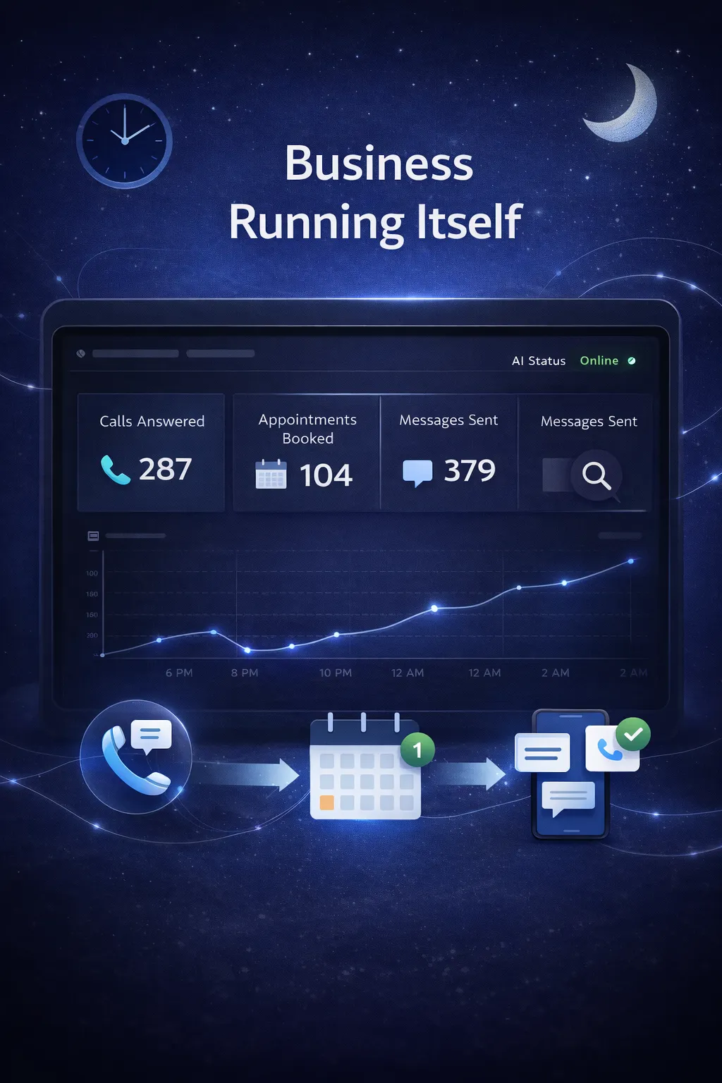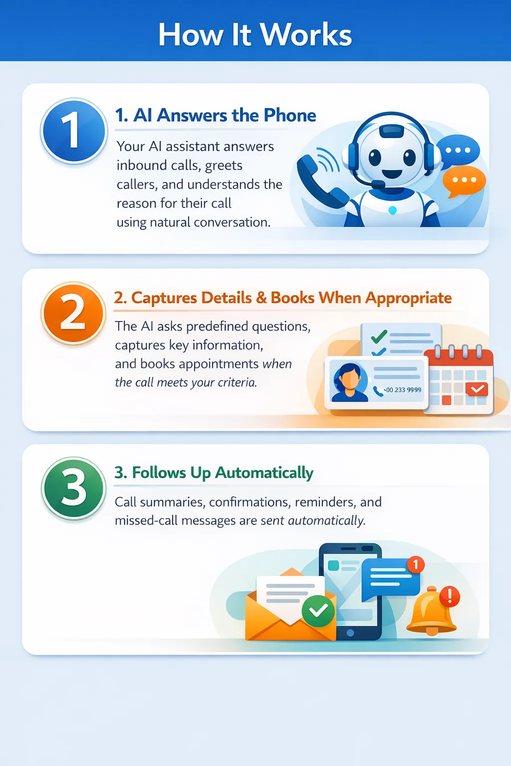 Call summaries, confirmations, reminders, and missed-call messages are sent automatically, ensuring no opportunity is lost.